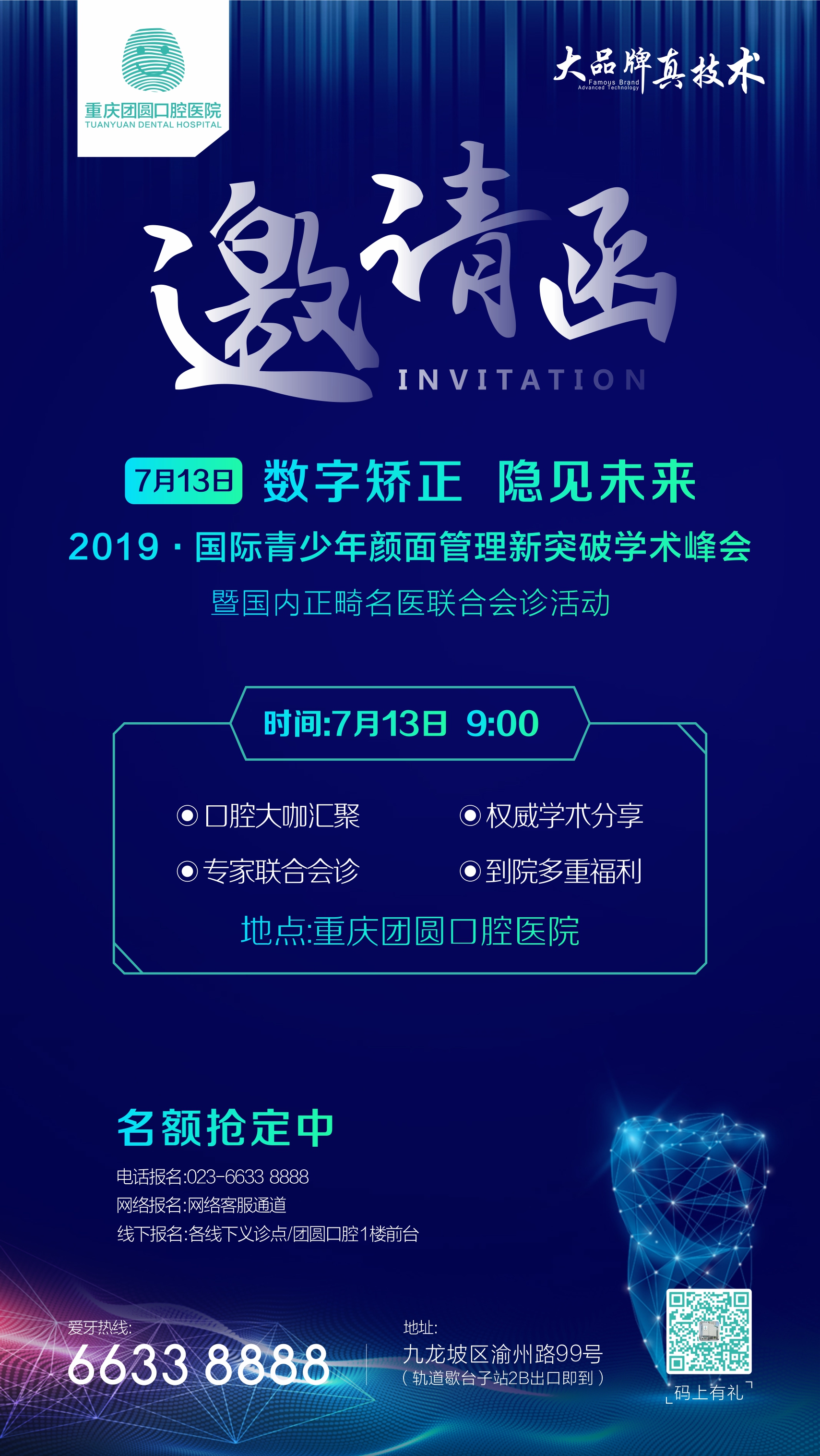 为使医生更深入的对儿童口腔颌面部正畸治疗进行交流,我院美学矫正中心张亚主任、彭继旭主任、两位在青少年正畸领域具有丰富临床经验的专家,以及特邀陆军总医院石咏梅副教授现对“青少年颜面管理新突破”为主题为大家全方位解析青少年正畸,这不仅是国际先进的正畸理念碰撞和交流,更是正畸权威、精湛技术的完美呈现,也是一场始于创新、落于实践,链接国际正畸诊疗新理念的口腔界盛宴,7月13日,我们期待您的到来!